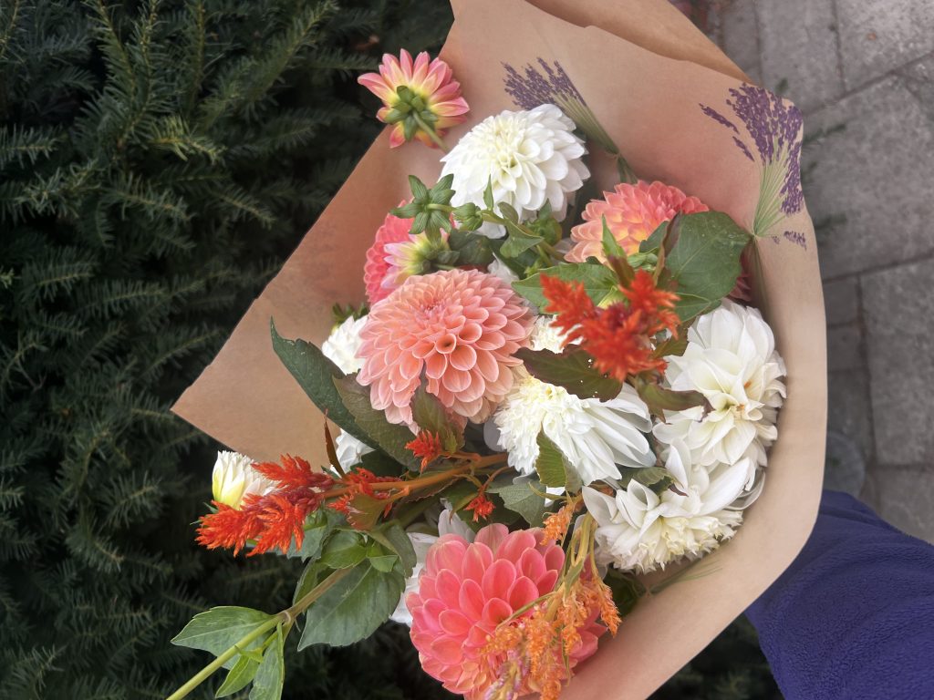 Hi, I’m Elsa and I grow flowers in Streatham in South West London and in Epsom, Surrey. I sell locally in cafes and from my home from the end of March until Christmas. We grow a range of annuals and perennials with speciality tulips in the Spring and Dahlias throughout the summer and autumn. I supply sustainable and compostable funeral arrangements, bouquets and event flowers. arrangement. I run flower arranging classes for companies and small groups. A great idea for team building or just a social occasion. Buckets for DIY weddings are also available. Local delivery.